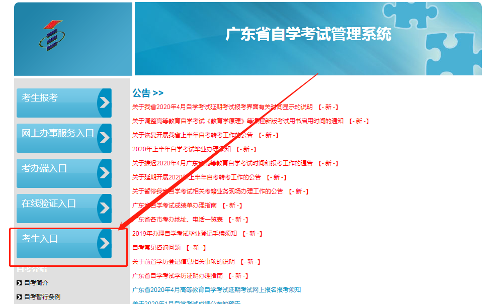 2、考生进入到广东省自学考试管理系统,点击【考生入口】按钮进入考生登录页面,输入准考证号、密码和验证码登录。