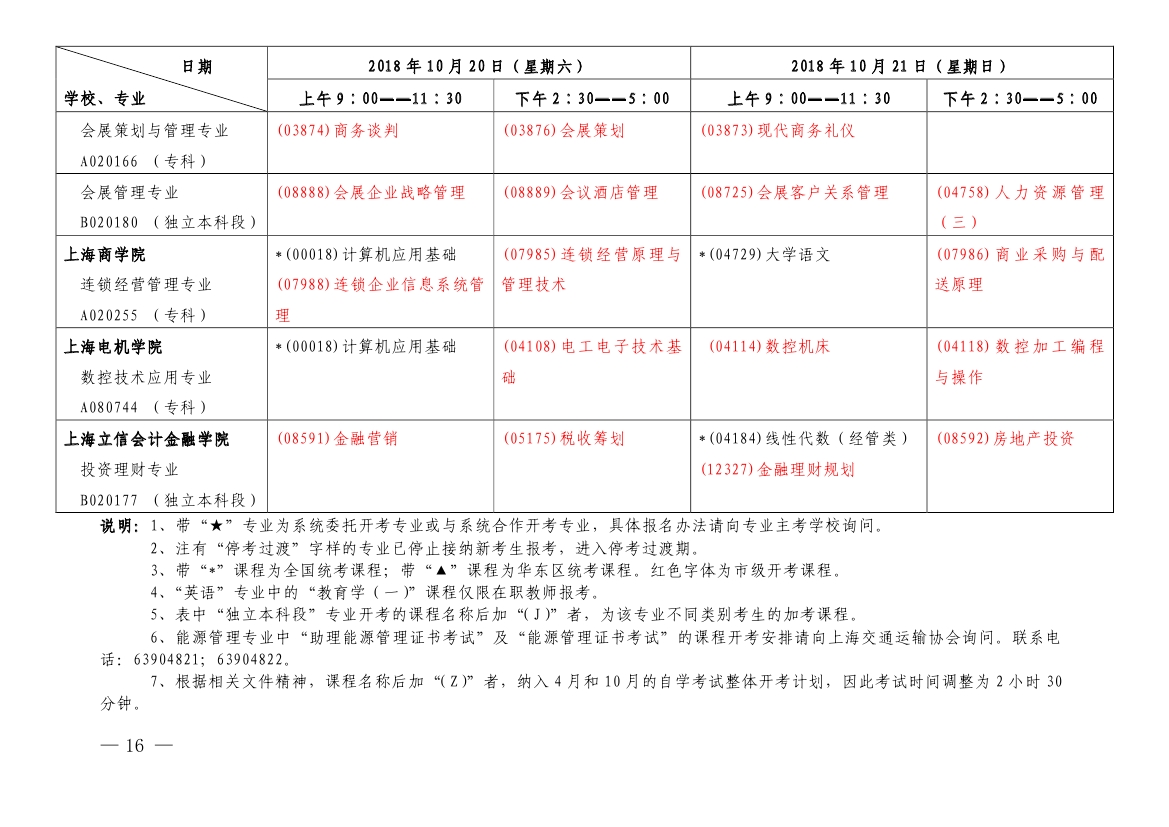 【第一周】2018年10月上海市自学考试各专业课程考试日程安排表